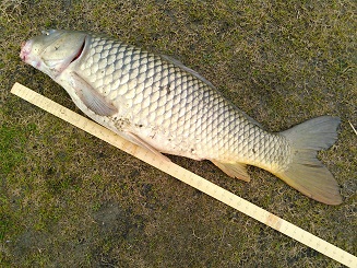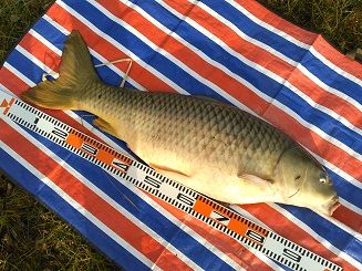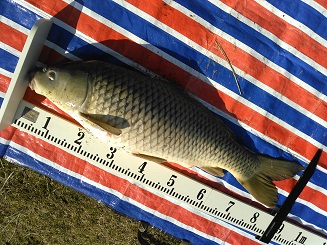 1月28日(土)9:00~15:30 なんと午前中にアタリ7発 しかし、ニゴイ4匹、のらず2発。 10:30頃、K氏が遊びにきたタイミングで 一気に横に走る確実に鯉のアタリ 早い目に竿をもってリールを巻いたつもりですが、 強烈な引きで掛かりに入られてしましました。 以前にも経験していた場所だったので、 もっと強引に行くべきでした。 諦めきれなかったので、 竿を持って、水際を草木をかき分け、 多少水に濡れながら、掛かりの近くまで行くと 水の中に大きな木の枝が上を向いて、 2本あるのが確認できました。 断念 1月29日(日)7:40~13:30 いつもよりちょっと早めに1投目 約1時間後、 50mラインに投入していた竿にアタリ、 しかしこれもなんと、一気に横に走る 必死でリールを巻きましたが、 小さいリール(ABU5000番)なので、 全く追いつかず、 ラインがほぼ岸と平行になり、ラインブレイク。 そしてすぐに根掛かり ショックでちょっとボーっとしましたが、 まだまだと思い竿を置いて、 根掛かりを外すためにラインを持った瞬間 もう1本の竿(30mラインに投入)にアタリ これも結構な引き これは逃がすまいと、 ちょっと強引に寄せて なんとか取り込みました。 約94cm ついにやりました。 HITボイリー:マルキュー クレデンスミルキーミルキー 自分が成長すれば、 確実に魚は近くなる 鯉釣りは本当に面白いと思います。 |