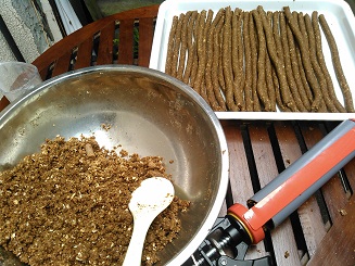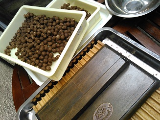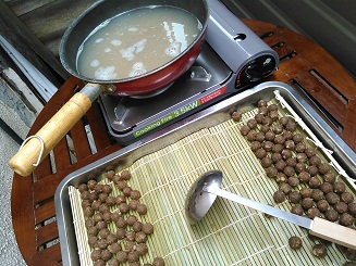 今週末は釣りは休み。 家でも「なんで行けへんの?」と言われましたが、 以前からやってみようと思っていた ボイリー作りに挑戦してみました。 始めは5~6Kg作るつもりで、 材料を調達しましたが ボイリーを丸めるのにてこずり、 2Kgもできませんでした。 ボイリーガンやローリングテーブルがあるので 楽勝と思っていましたが甘かったです。 周りの人がやめといたほうがいいと 言うのがよくわかりました。 味は大豆、魚粉ベースの醤油味で 匂いはきつくないですが、 人間的には食べたら美味しい(はず)です。 カビを防止するために食品添加物を入れました。 今回は通常食品に使用する場合の量の 少し多めにしてみました。 入れる量は試行錯誤して調整していく予定です。 今回のボイリー作りは失敗となりましたが、 ボイリーを丸める工程を考え直して 再挑戦したいと思います。 今日作ったボイリーは次回の釣りで使います! |